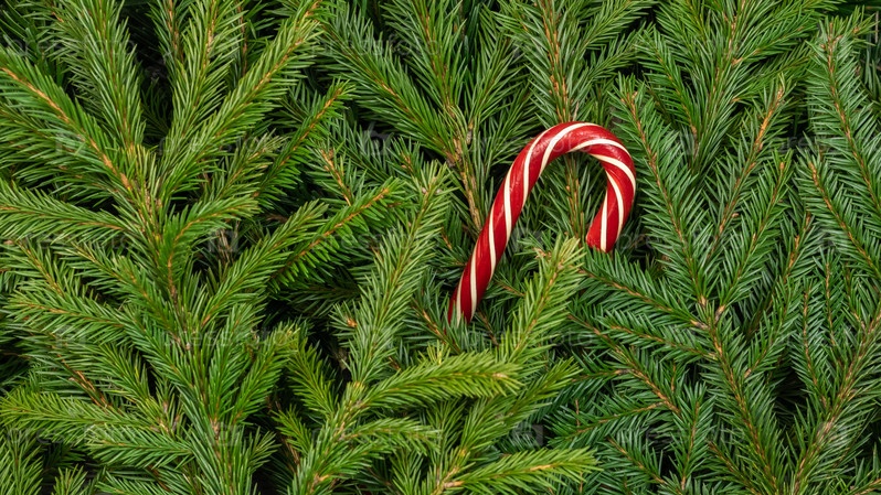 Фон из веток елки с рождественскими конфетами