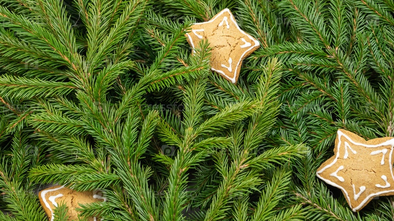 Фон из веток елки с печеньем в форме звезд