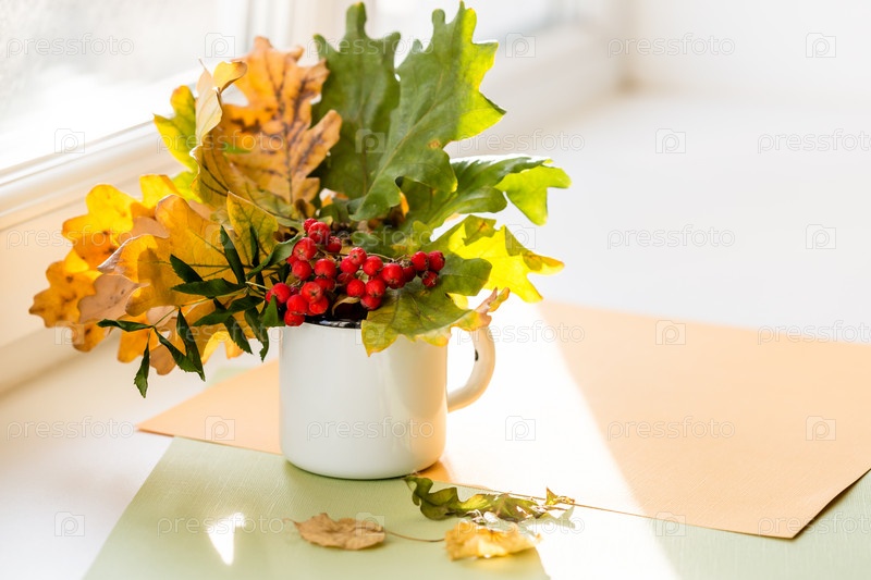 Осенняя композиция с букетом желтых осенних листьев и веточками рябины в чашке. Концепция осеннего сезона, пространство для копирования