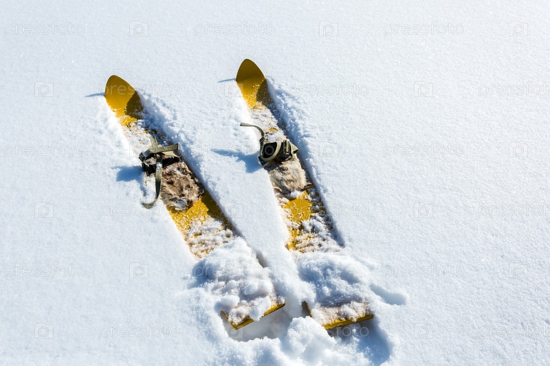 Пара старомодных деревянных желтых лыж на белом снегу