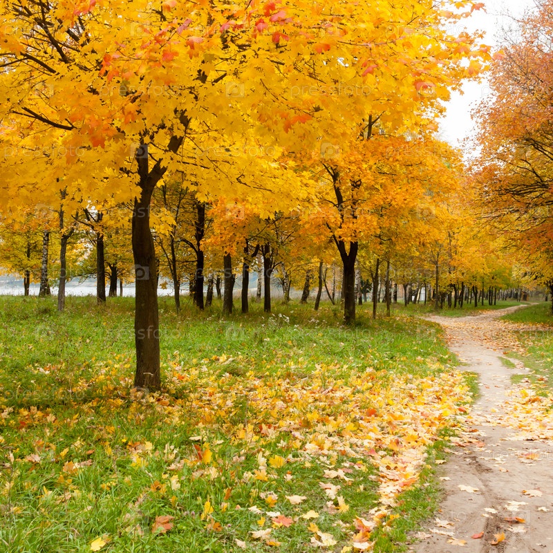 Осень в парке. Кленовые деревья с желтыми листьями возле тропы, осенний пейзаж с кленовым деревом