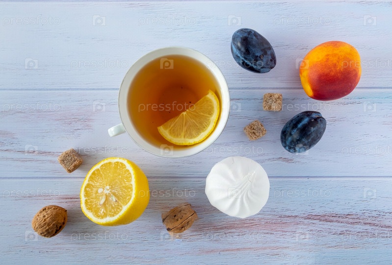 Пищевой фон с белой фарфоровой чашкой чая, лимоном, спелыми сливами и нектаринами, грецкими орехами и белым зефиром