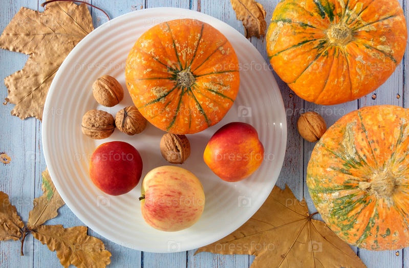 Осенний фон из сухих листьев с белой фарфоровой тарелкой, маленькие красивые тыквы, сезонные фрукты, грецкие орехи