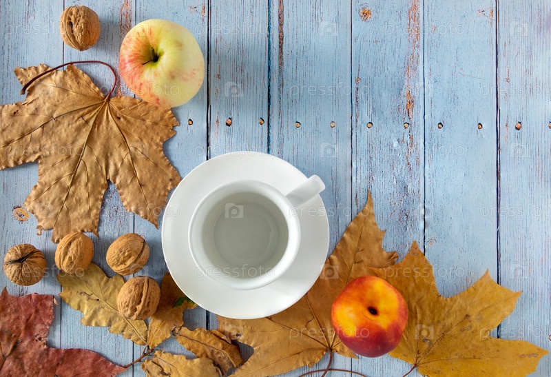 Осенний фон из сухих листьев с белой фарфоровой чашкой для кофе или чая, яблоком, нектарином, грецкими орехами. Горизонтальная ориентация, выборочный фокус, вид сверху, копирование специй