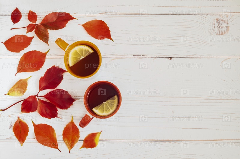 Светлый деревянный фон с осенними листьями девичьего винограда, плющом и двумя чашками чая с лимоном