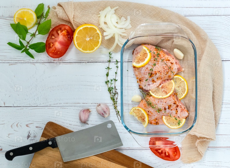 Куриные бедра с лимоном и специями на стеклянном противне, подготовленные для запекания