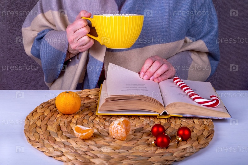 Натюрморт с книгой, новогодний декор на столе. Женщина средних лет в палантине держит большой желтый
