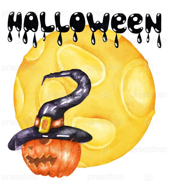 Хэллоуин. Тыква, шляпа и луна. Акварель (2)