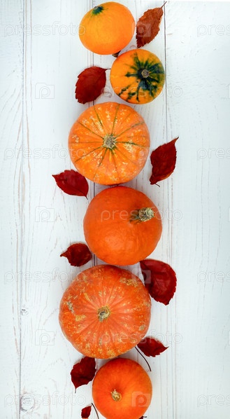 Маленькие спелые тыквы выложены в ряд на светлом деревянном фоне