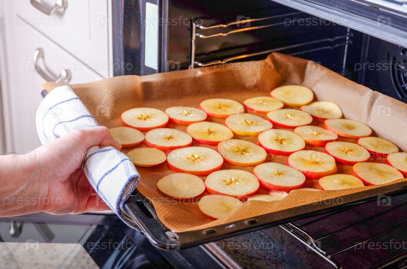 Женщина-домохозяйка кладет противень с нарезанными яблоками в электрическую духовку для просушки