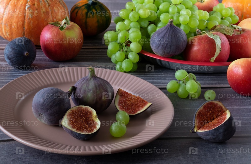 Спелые свежие инжир, виноград, яблоки и тыквы на столе с деревянной поверхностью. Урожай, осенние фрукты, здоровая пища. Горизонтальная ориентация, выборочный фокус
