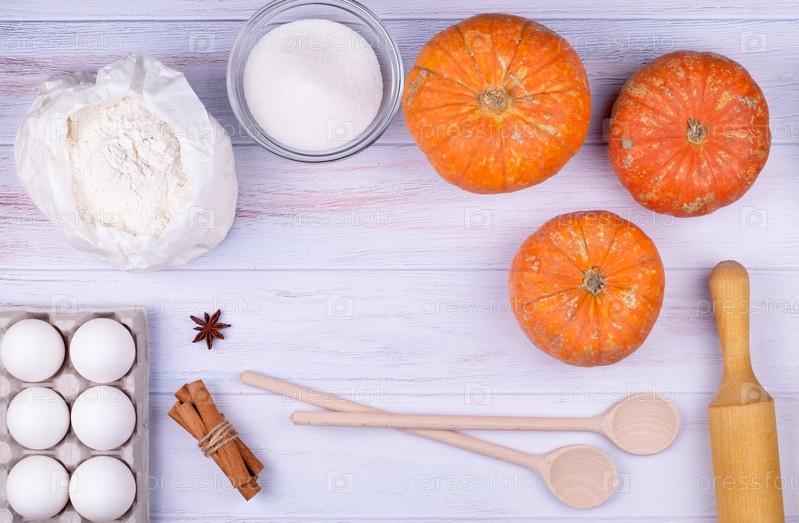 Вид сверху, плоская кухонная утварь и ингредиенты для приготовления тыквенного пирога