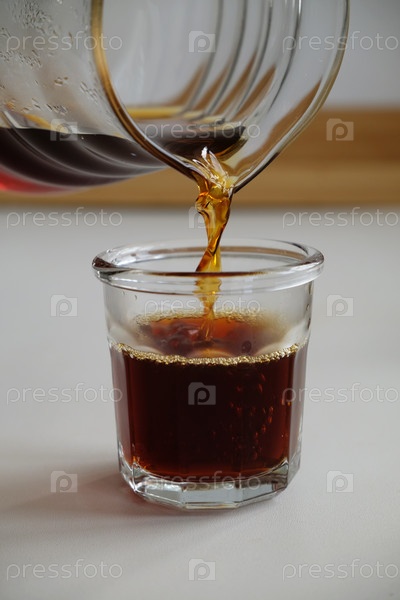 Концепция специального кофе. Черный фильтрованный кофе льется в стеклянную чашку из стеклянного графина, крупным планом