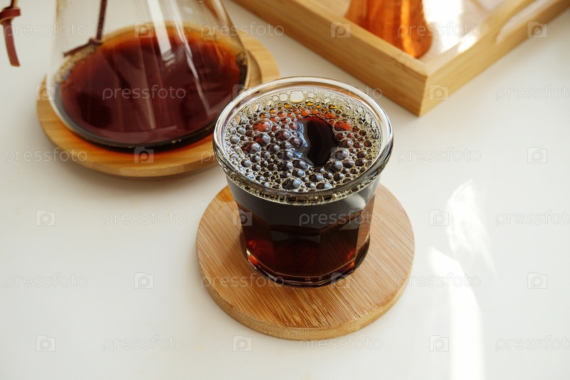 Очень шипучий газированный кофе в стакане. Ручное пивоварение, специальная концепция третьей волны