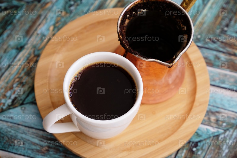 Черный кофе в белой чашке и медная турка на круглой бамбуковой подставке. Традиционный турецкий метод