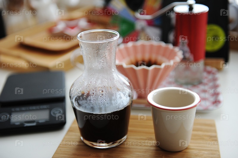 Ручной пивоваренный натюрморт. Разливной фильтрованный кофе подается в графине на бамбуковой доске. Специализированная эстетика третьей волны