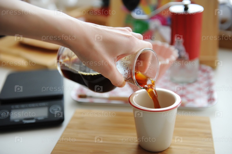 Ручной пивоваренный натюрморт. Лить фильтр кофе из стеклянного кувшина в чашку. Бамбуковая доска. Специализированная эстетика третьей волны