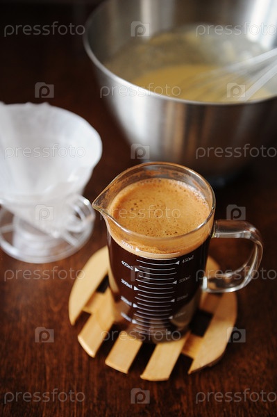 Приготовление кофейных блинов. Тесто в миске с венчиком. Кофейный настой в кувшине и бумажном фильтре. Темный деревянный стол
