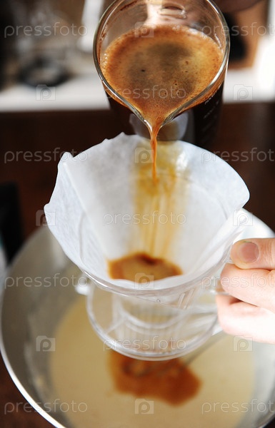 Процеживание заваренного кофе из кувшина через воронку с бумажным фильтром в тесте. Процесс приготовления блинов