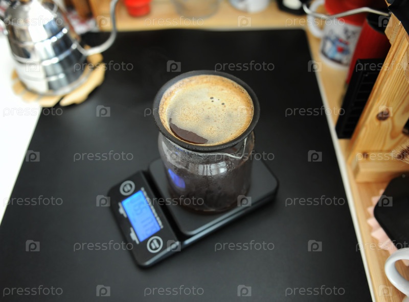 Черный пористый керамический безбумажный кофейный фильтр на стеклянном кувшине. Чайник на гусиной шее. Электронные весы. Натюрморт с ручным пивоварением