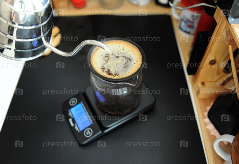 Черный пористый керамический безбумажный кофейный фильтр на стеклянном кувшине. Чайник на гусиной шее. Электронные весы. Натюрморт с ручным пивоварением