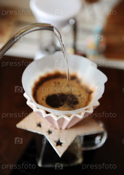 Альтернатива ручному завариванию кофе в розовой керамической капельнице с бумажным фильтром. Закрыть. Чайник на гусиной шее