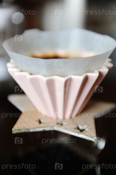 Альтернатива ручному завариванию кофе в розовой керамической капельнице с бумажным фильтром. Крупным планом