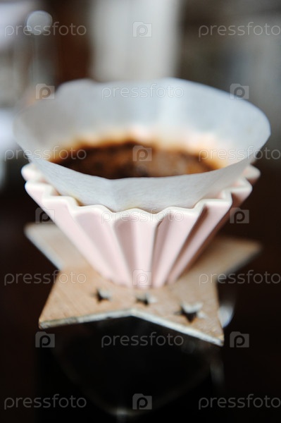 Альтернатива ручному завариванию кофе в розовой керамической капельнице с бумажным фильтром. Крупным планом