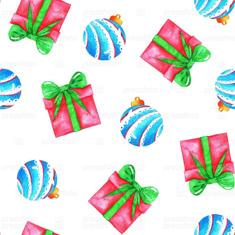 Подарок и елочная игрушка. Рождество (Новый год) бесшовный фон. Акварель