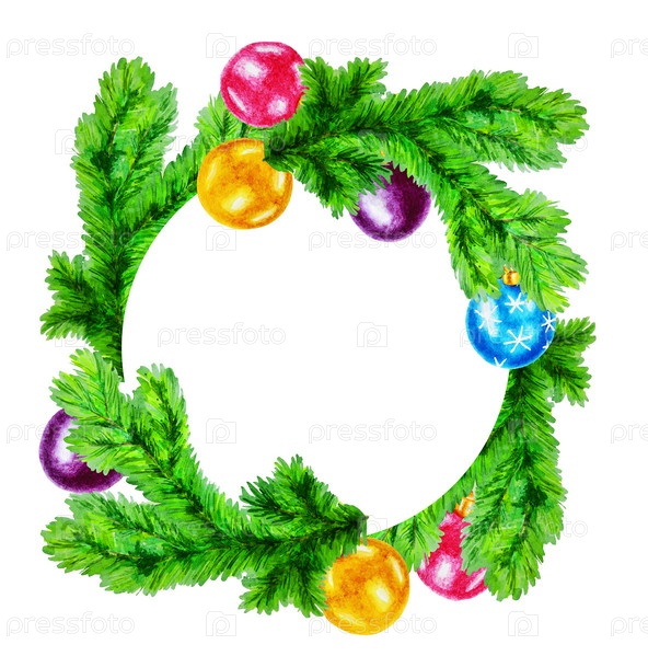 Венок из еловых веток и новогодних украшений. Акварель