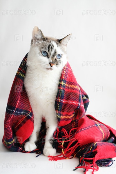 Симпатичная белая голубоглазая кошка, завернутая в теплое уютное красное одеяло на белом фоне