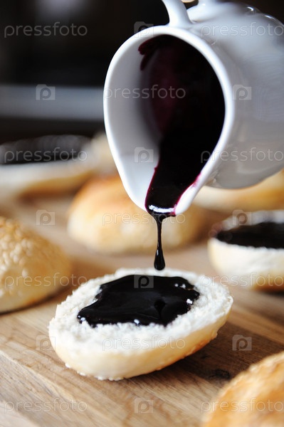 Темно-ягодный черничный соус выливают из белого фарфорового соусника на булочку для гамбургеров крупным планом. Процесс приготовления