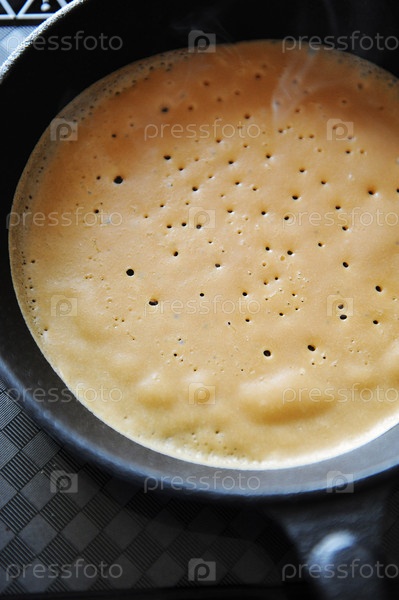 Процесс выпечки блинов. Нежные пористые блинчики на чугунной сковороде. На электрической индукционной плите. Горячий пар