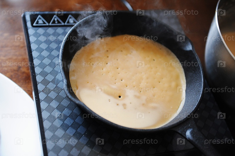 Процесс выпечки блинов. Нежные пористые блинчики на чугунной сковороде. На электрической индукционной плите. Горячий пар