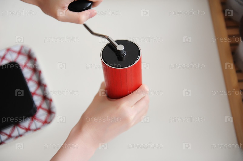 Альтернативное пивоварение. Помол кофе в красной ручной кофемолке. На белом фоне. Концепция специализированной эстетики третьей волны