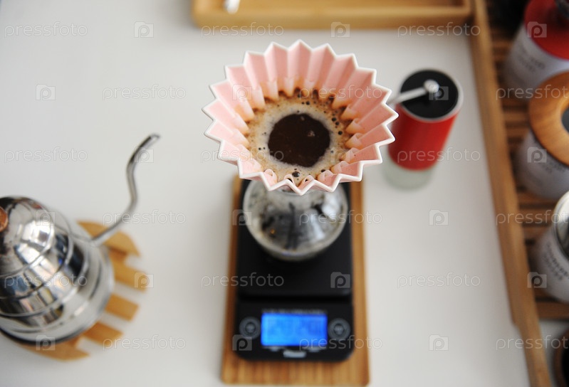 Альтернативное ручное пивоварение. Розовая капельница оригами с фильтром бумажной волны на графине на электронных весах. Вид сверху