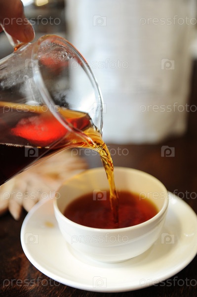 Перелейте свежезаваренный черный чай из стеклянного кувшина в керамическую чашу