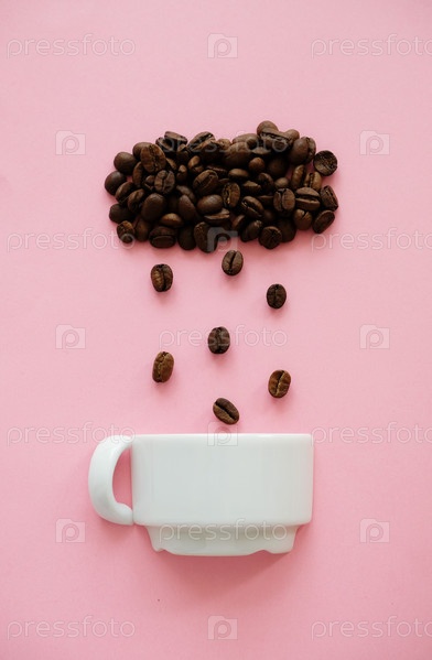 Кофейные зерна в форме облака, льющего дождь, падают в белую чашку на розовом фоне