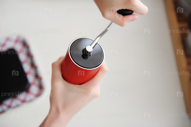 Альтернативное пивоварение. Помол кофе в красной ручной кофемолке. На белом фоне. Концепция специализированной эстетики третьей волны
