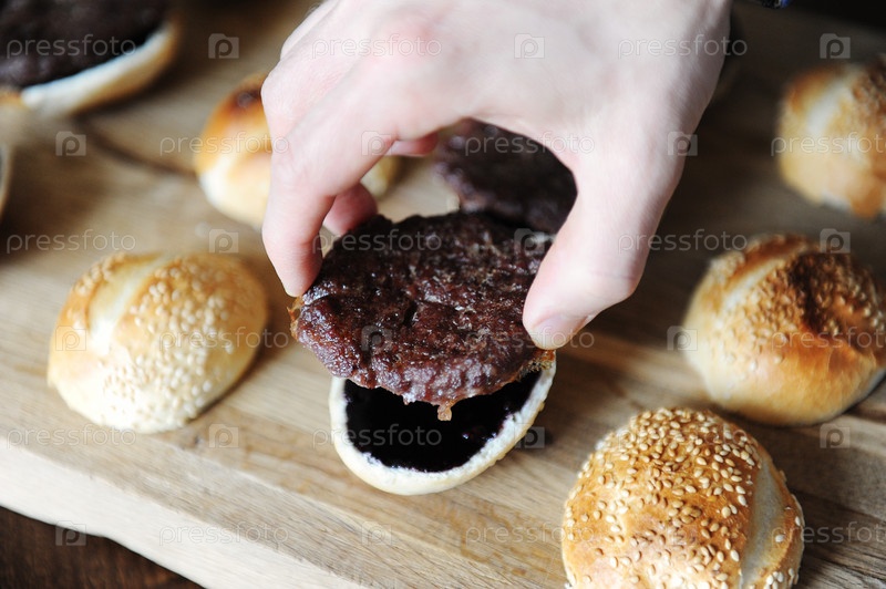 Процесс приготовления мини-бургеров. Котлета на булочке с кунжутом