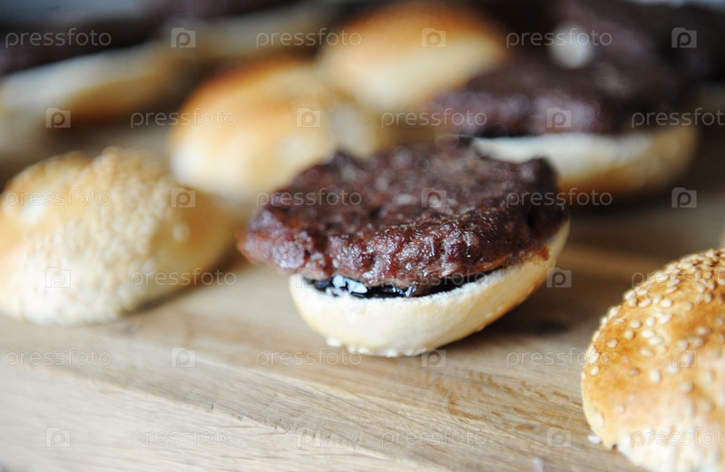 Процесс приготовления мини-бургеров. Котлета на булочке с кунжутом