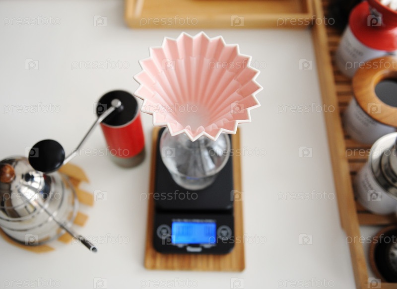 Альтернативное ручное пивоварение. Розовая керамическая капельница оригами с бумажным волновым фильтром. Вид сверху. Красный измельчитель