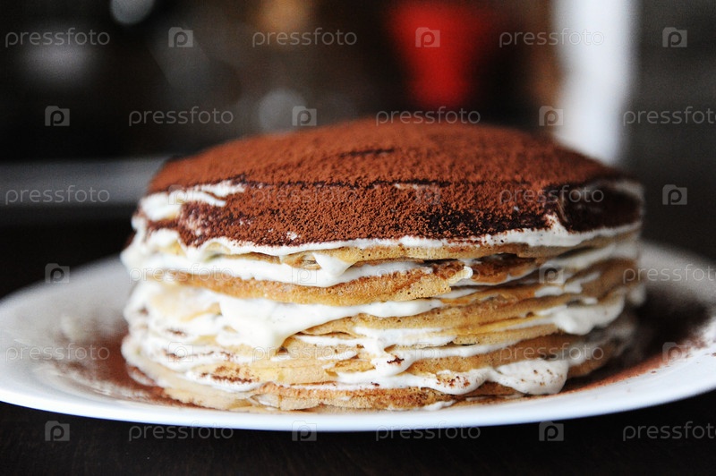 Блинный торт с начинкой тирамису, посыпанный какао-порошком. Белая тарелка, фон кофейни. Вид сбоку, крупный план