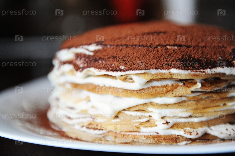 Блинный торт с начинкой тирамису, посыпанный какао-порошком. Белая тарелка, фон кофейни. Вид сбоку, крупный план
