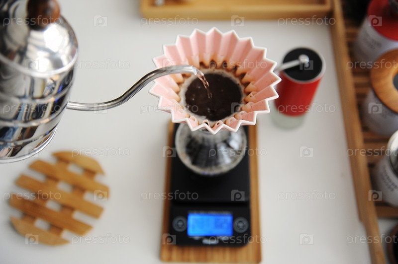 Альтернативное ручное пивоварение. Лить воду в кофе в розовой капельнице оригами с волновым бумажным фильтром. Вид сверху