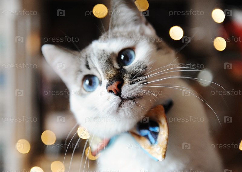 Красивый портрет белого голубоглазого пушистого кота в галстуке-бабочке. Фон размытых волшебных огней. Новогоднее настроение