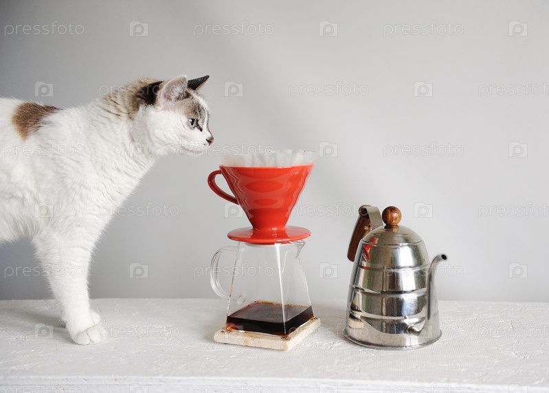 Белый кот и заваривание капельного кофе в красной заливке. Гусиная шея чайника. Белый фон