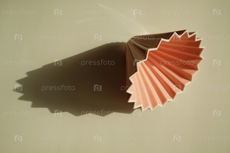 Кофейная капельница оригами на белом фоне. Яркий солнечный свет и четкая геометрическая тень