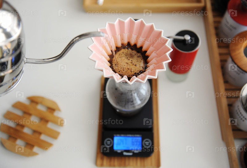Альтернативное ручное пивоварение. Лить воду в кофе в розовой капельнице оригами с волновым бумажным фильтром. Вид сверху