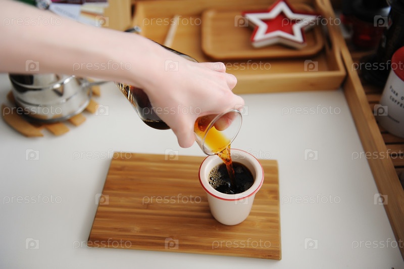 Ручной пивоваренный натюрморт. Переливание фильтрованного кофе из графина в чашку. Бамбуковая доска. Специализированная эстетика третьей волны